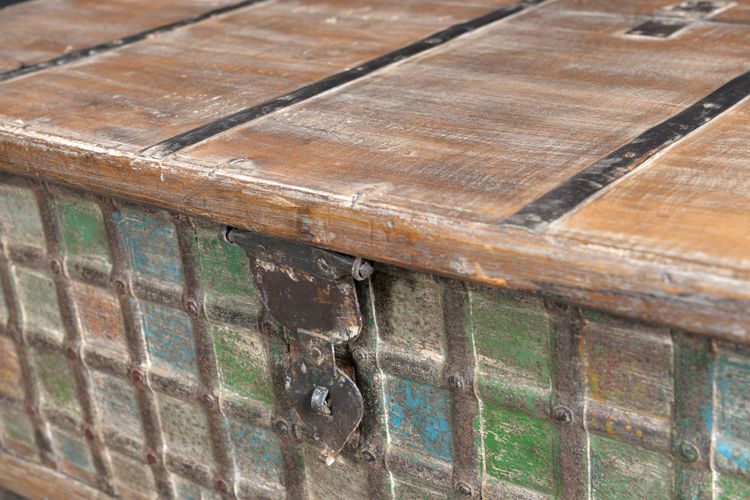 Die Kombination aus Cassettenoptik und Altholz macht diesen Couchtisch zu einem unverwechselbaren Dekorstück.