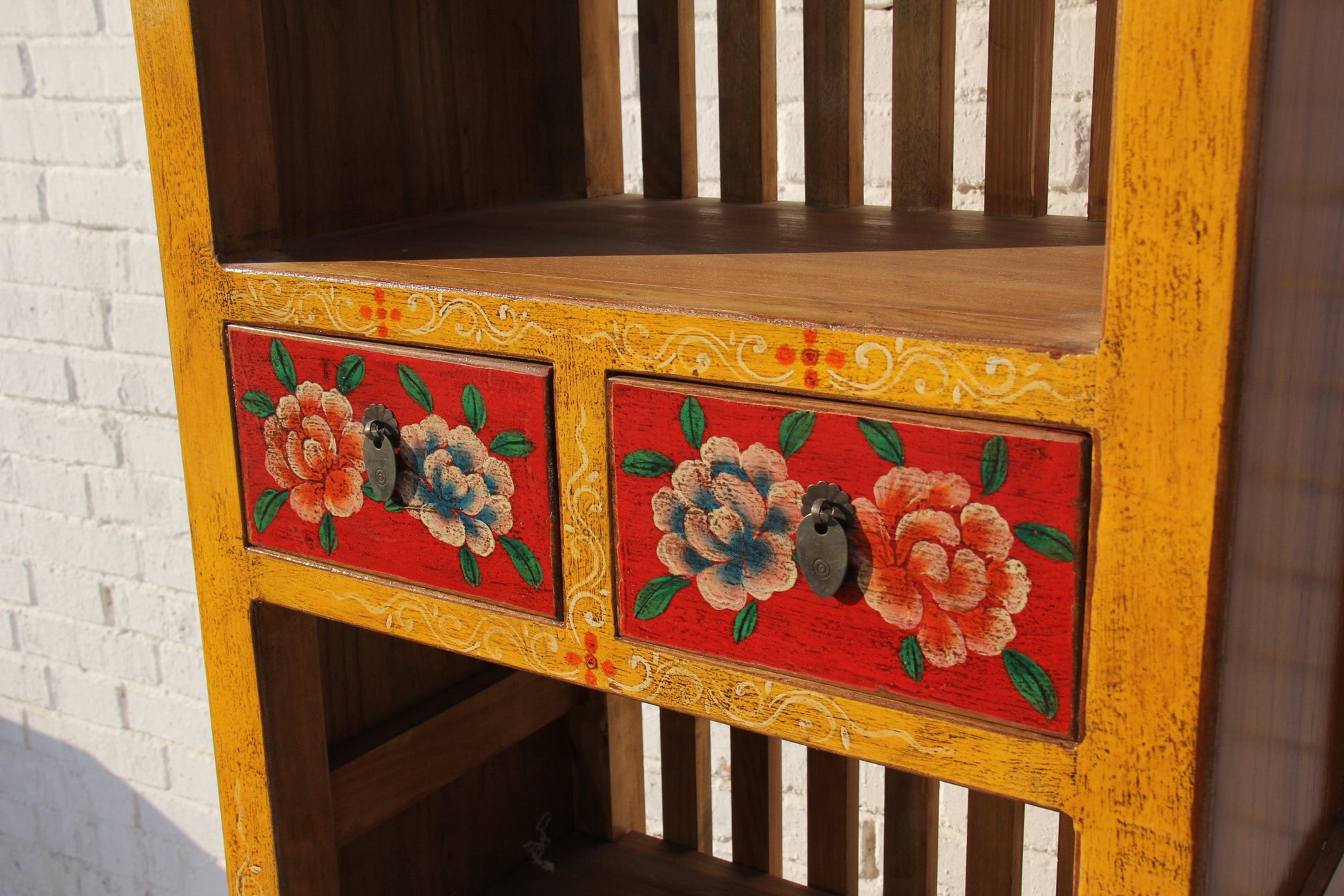 Die traditionellen tibetanischen Bemalungen machen diesen Hochschrank zu einem besonderen Blickfang. Jede Zeichnung und jedes Muster erzählt eine eigene Geschichte und spiegelt die reiche Kultur Tibets wider. Diese kunstvollen Details sind das Ergebnis präziser Handarbeit und verleihen dem Möbelstück eine unvergleichliche Note.
