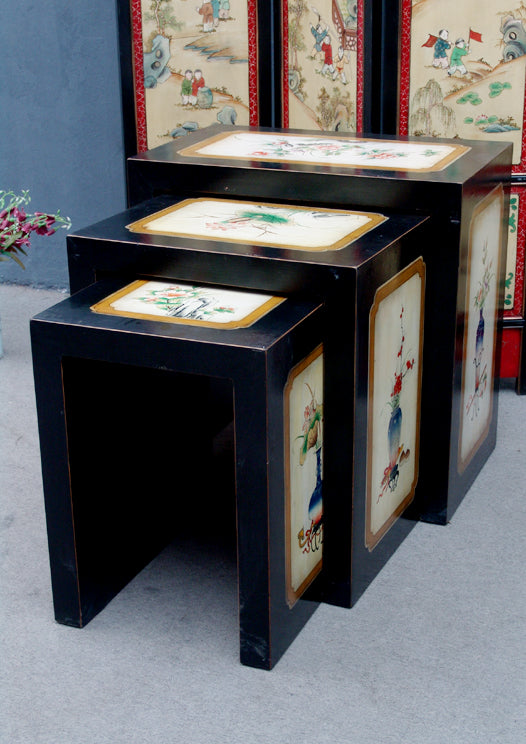 Diese 3er Tischgruppe stammt original aus den 60er Jahren und bringt klassischen Retro-Stil und asiatische Eleganz in Ihr Zuhause.